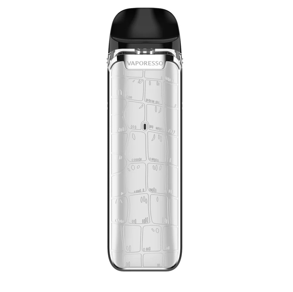 With a thinner chassis and textured body, the LUXE Q vape kit is designed similarly to Vaporesso's previous Luxe PM40 pod kit. In addition to having a chic and upscale appearance, the leather-styled panels are "anti-smudge" to prevent unsightly fingerprint smudges. The device's 1000mAh battery is housed within its small body and can be completely charged in about an hour using Type-C USB charging. When a pod is fitted and the user inhales, an LED indicator on the front of the device illuminates to show how much battery is left.